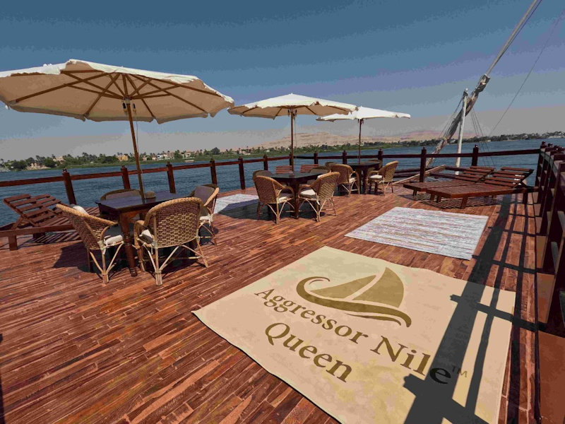 La cubierta de este incomparable barco cuenta con numerosos asientos mullidos y cómodos, decorados con una temática africana, tanto en una zona sombreada con un dosel de lona como en la parte delantera del barco, donde se puede disfrutar del sol. Hay muchas sillas de ratán y tumbonas disponibles en la terraza para relajarse mientras admira las bellezas de Egipto y su abundante vida salvaje mientras se desliza silenciosamente.