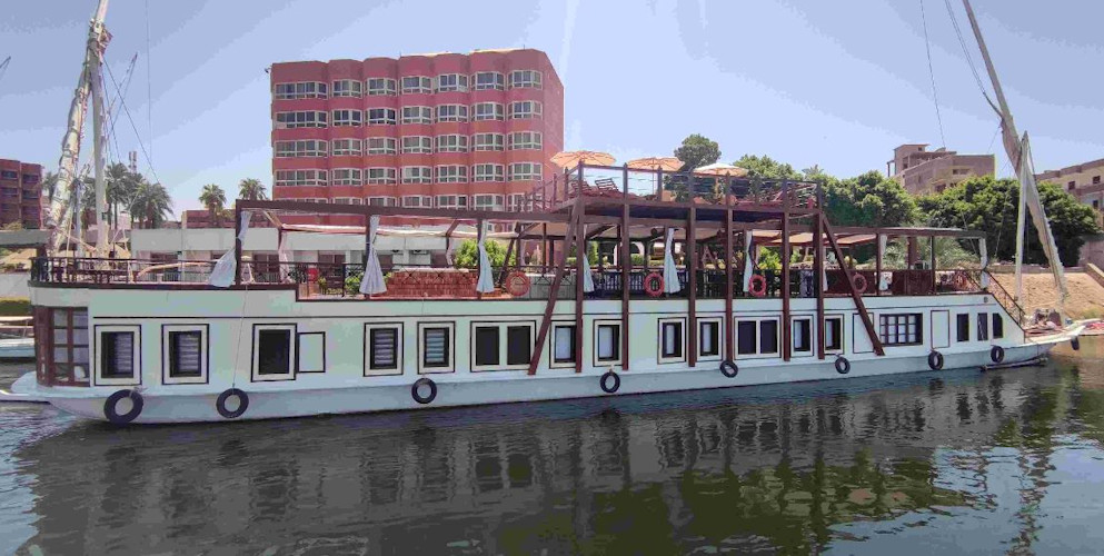 La cubierta de este incomparable barco cuenta con numerosos asientos mullidos y cómodos, decorados con una temática africana, tanto en una zona sombreada con un dosel de lona como en la parte delantera del barco, donde se puede disfrutar del sol. Hay muchas sillas de ratán y tumbonas disponibles en la terraza para relajarse mientras admira las bellezas de Egipto y su abundante vida salvaje mientras se desliza silenciosamente.
