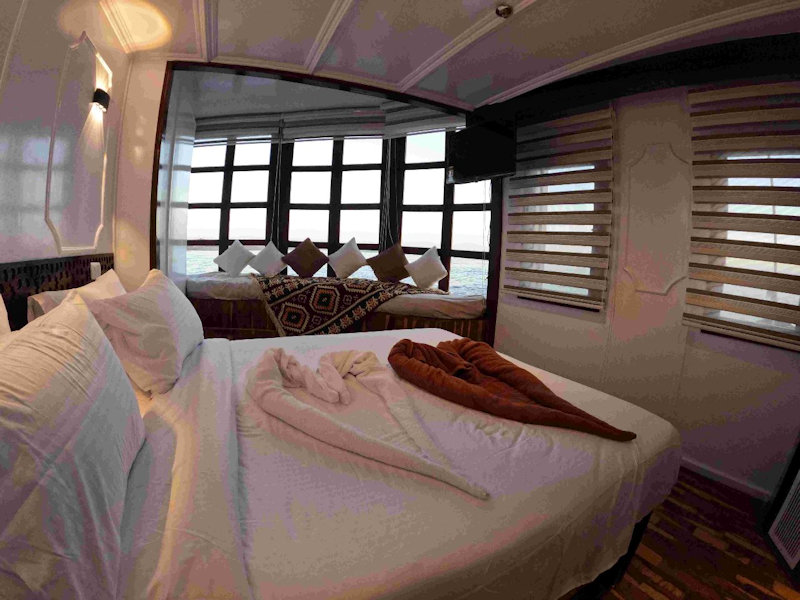 El African Queen cuenta con 10 amplios camarotes en un barco de 45 metros. Las cabañas cuentan con una cama doble o 2 camas individuales, todas con mucho espacio en los armarios y ventanas dobles para contemplar el paisaje. Las ventanas tienen contraventanas si prefieres una habitación más oscura y todas se abren para disfrutar de la suave brisa mientras navegas. Para su comodidad, cada ventana también está equipada con una mosquitera. Cada cabaña tiene su propio cuarto de baño grande con todas las comodidades modernas, incluyendo duchas de hidromasaje y muchas toallas suaves (algodón egipcio, por supuesto), perfectas cuando regresas de la exploración del desierto y quieres refrescarte.